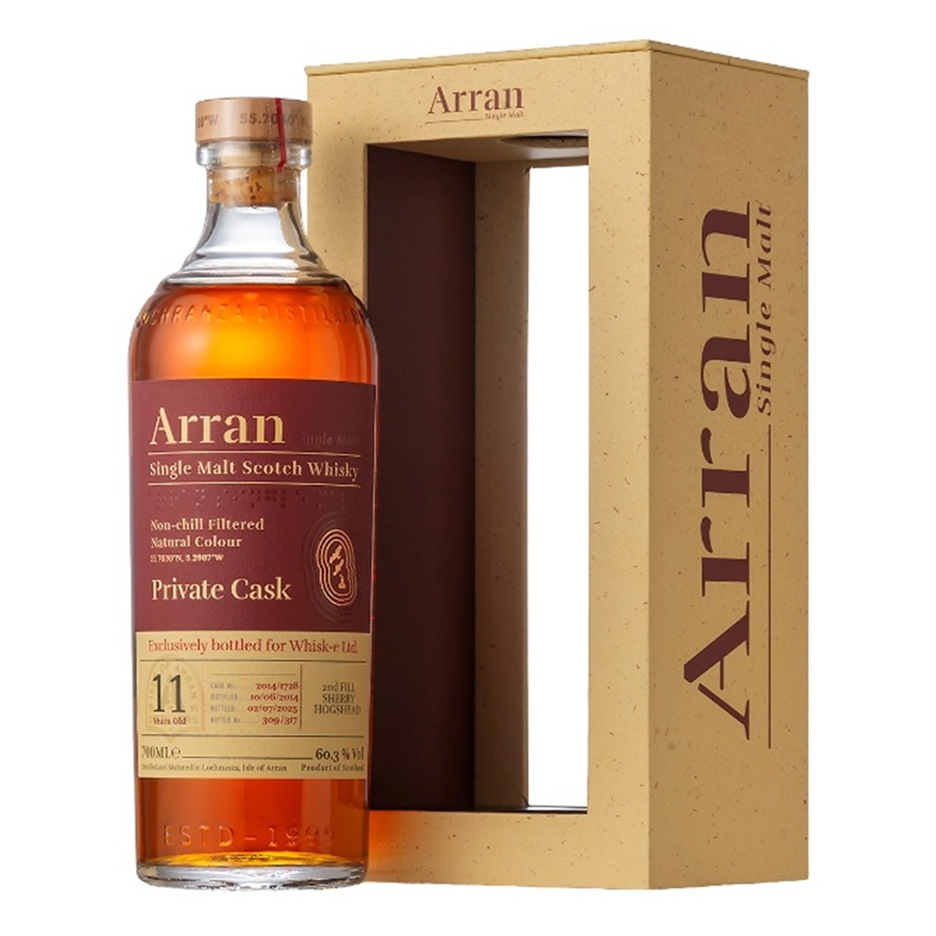 シェリーホグスヘッドで熟成されたアラン2014年蒸溜原酒。カスクストレングスならではの力強さとともに、ドライフルーツやチョコレート、スパイスの濃厚な風味が広がるリッチな味わいが魅力です。